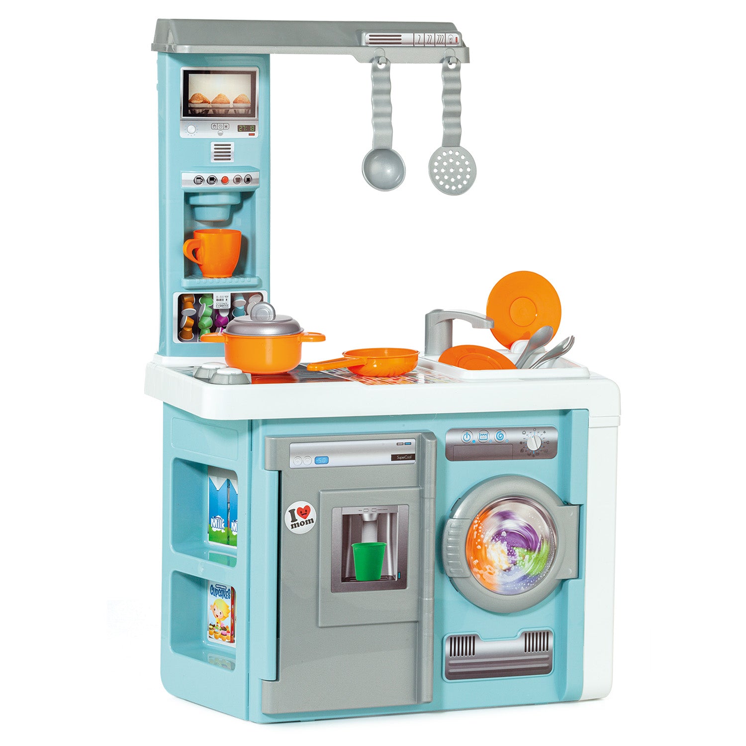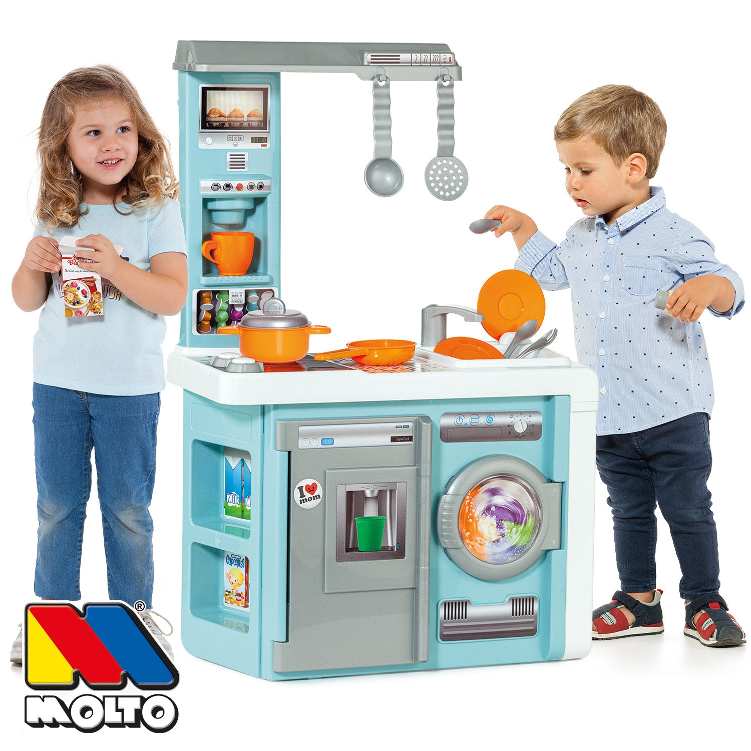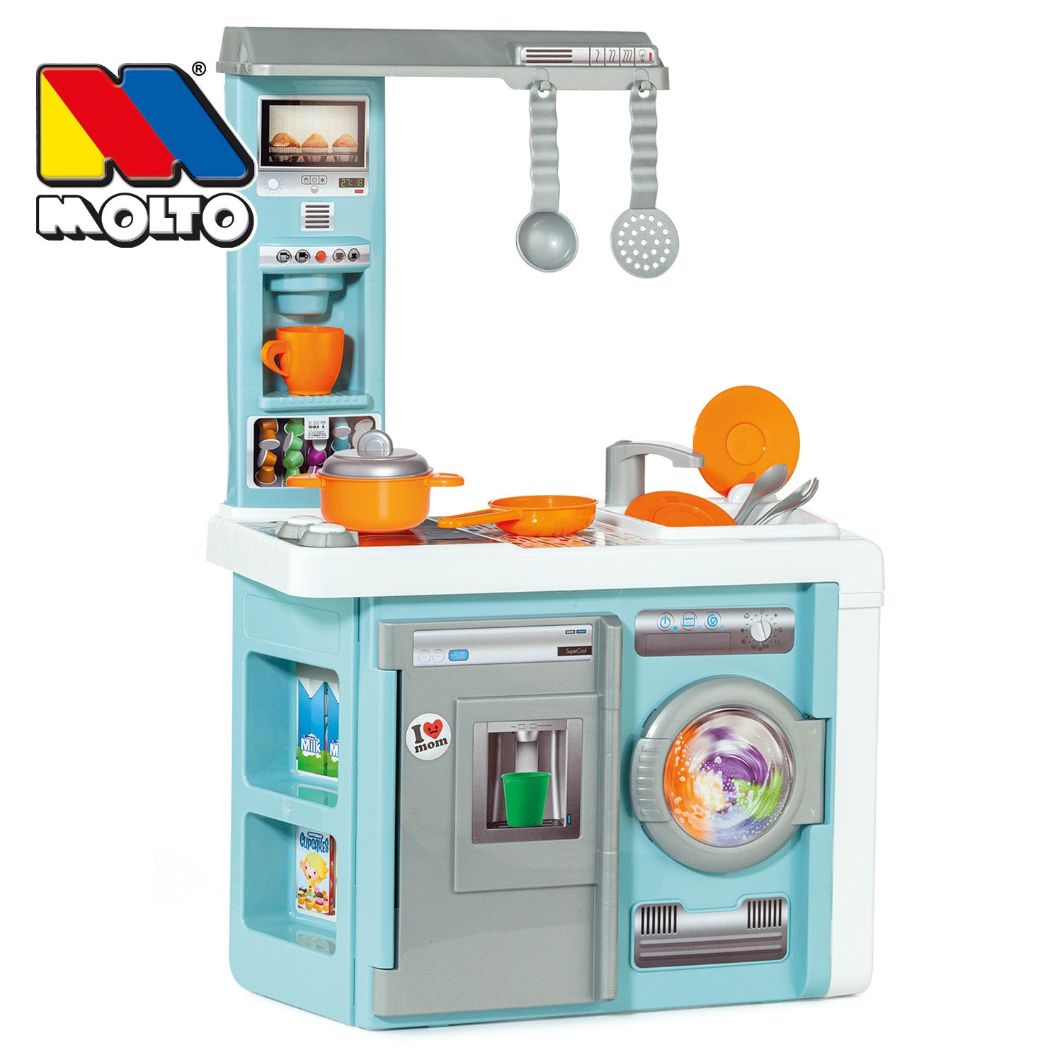 ¡La cocina de juguete que lo tiene TODO! Esta fabulosa cocina infantil de Molto está totalmente equipada con horno, campana extractora, microondas, lavadora y 12 accesorios para una experiencia de juego realista, divertida y educativa. Sus puertas que se abren y cierran hacen que los pequeños se sientan como verdaderos chefs en su propia cocina.