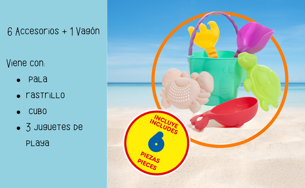 ✔️ 6 accesorios de playa: pala, rastrillo, cubo y 3 juguetes extra para excavar y construir castillos
