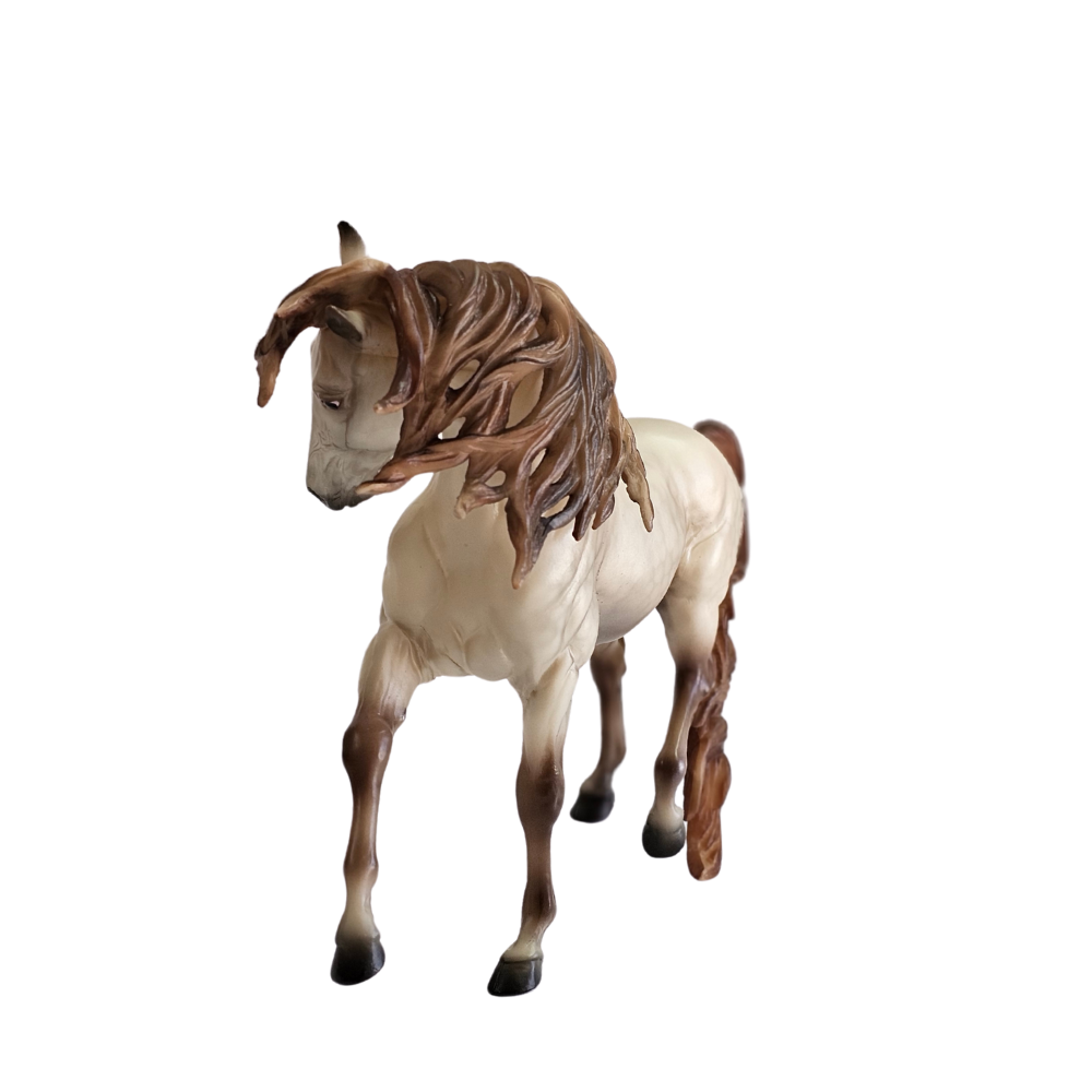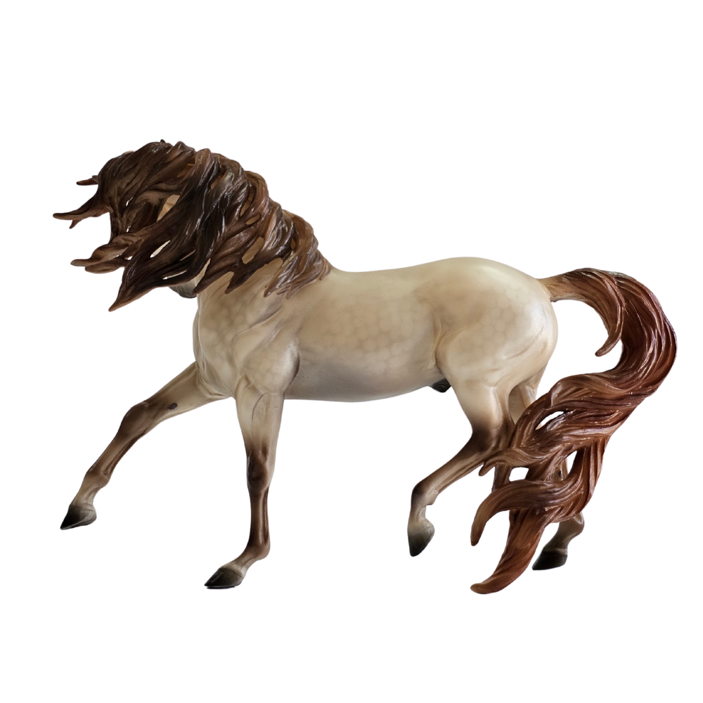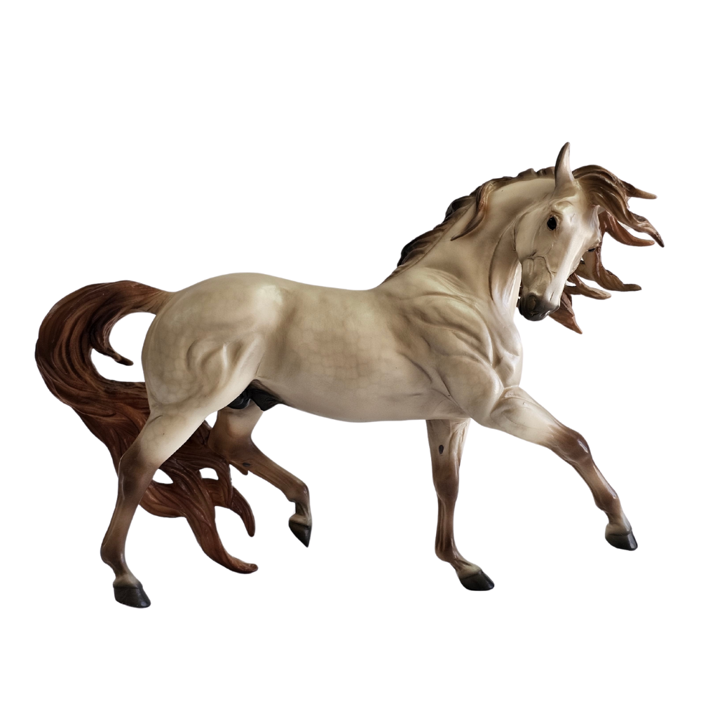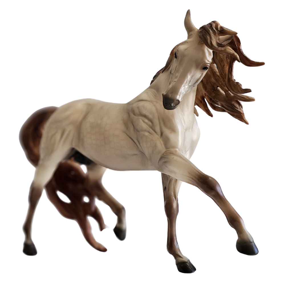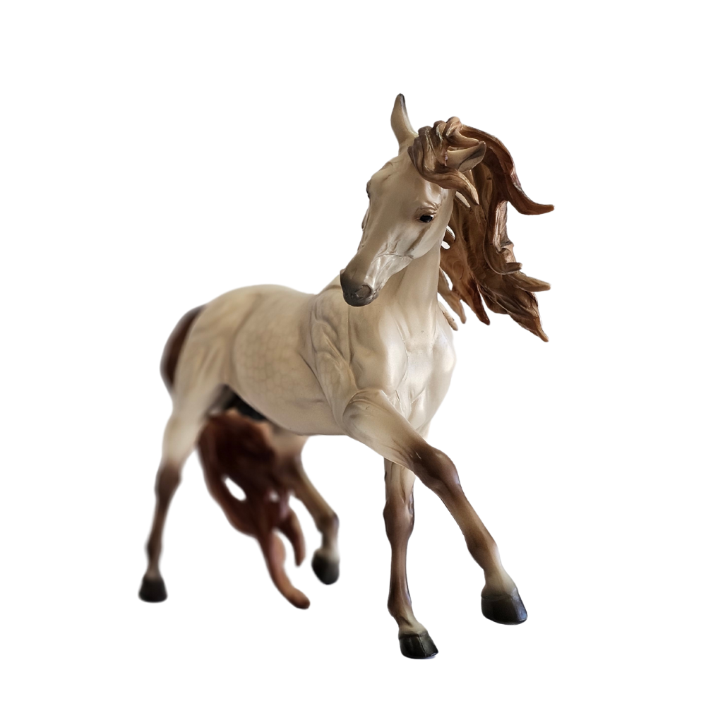 Este modelo captura a la perfección la esencia de los caballos lusitanos: musculatura definida, pelaje perlado con reflejos dorados y una melena caoba que parece moverse con el viento. ¡Toda una obra maestra para coleccionistas y amantes de los caballos!