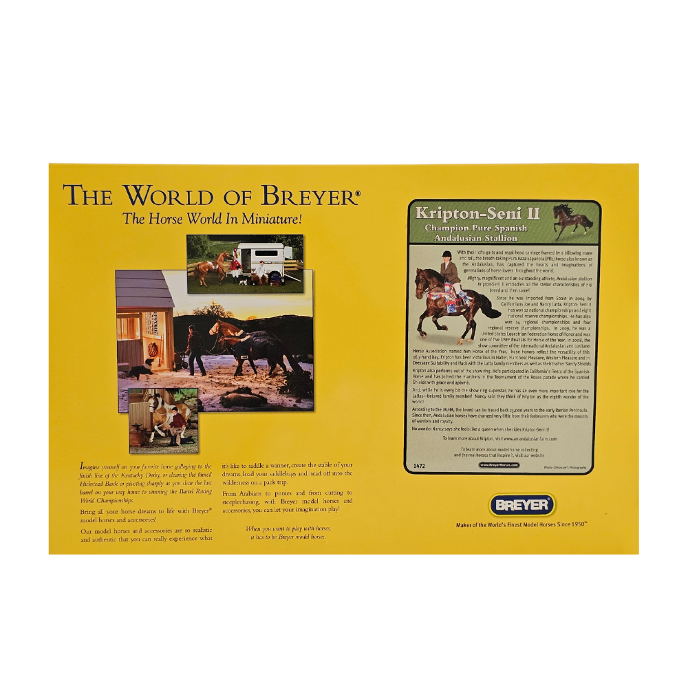 Este impresionante modelo de Breyer rinde homenaje al célebre semental importado de España en 2004 y que desde entonces ha conquistado los corazones y las pistas de competición en EE.UU. Con 16.3 manos de pura presencia, Kripton ha ganado más de 30 títulos nacionales y regionales, y ha sido galardonado como Caballo del Año por la IALHA (2008) y USEF Horse of Honor (2009), además de su ingreso al Horse Stars Hall of Fame en 2013.