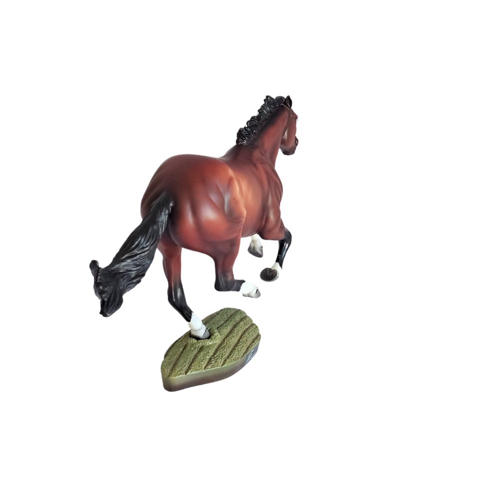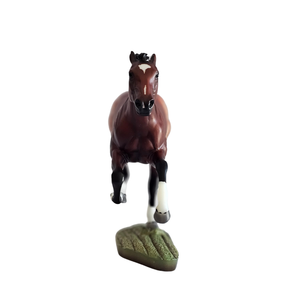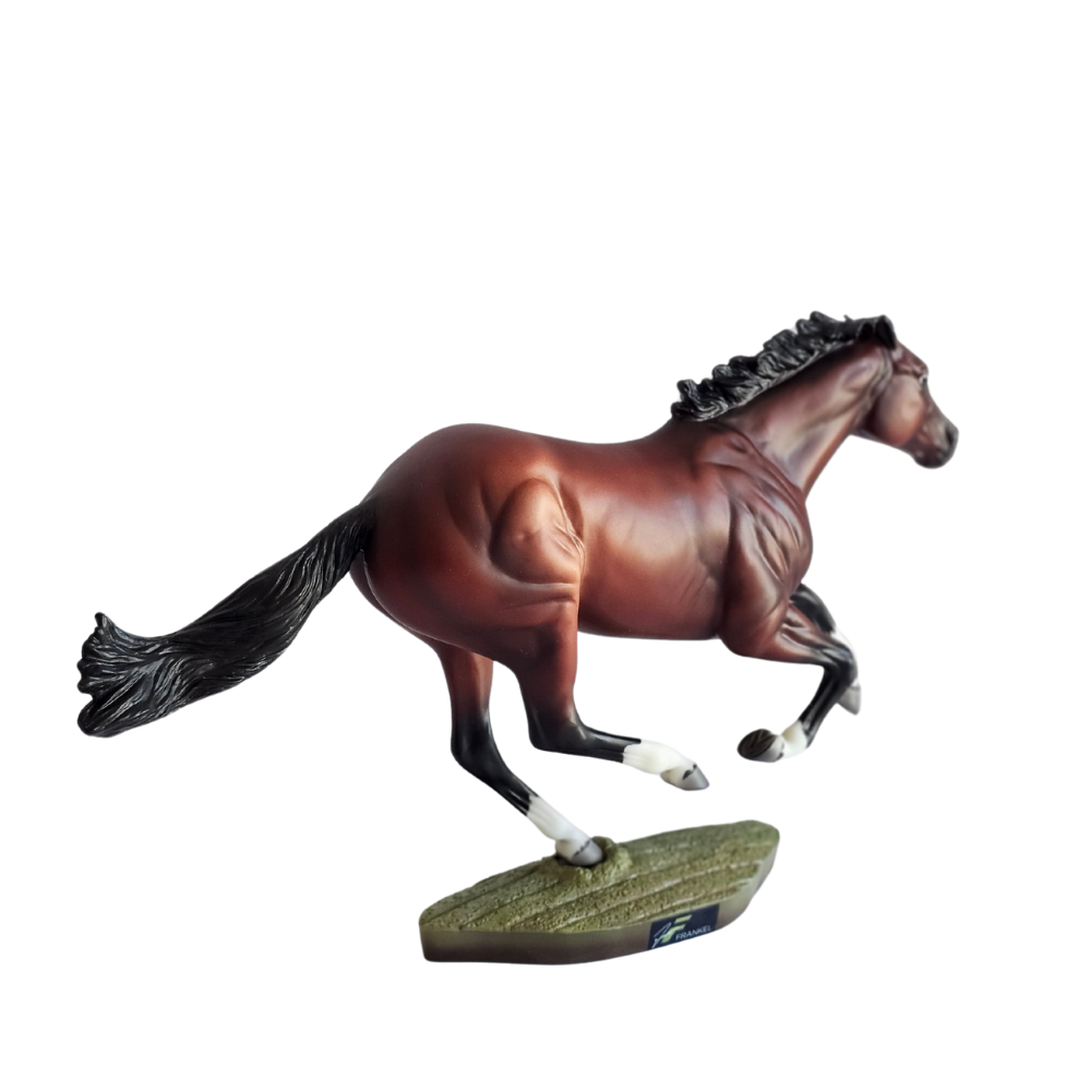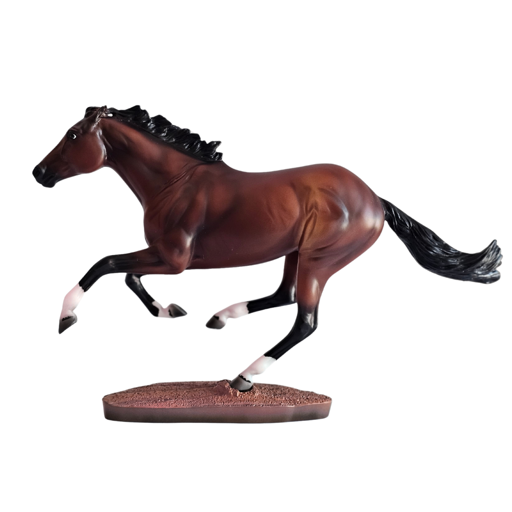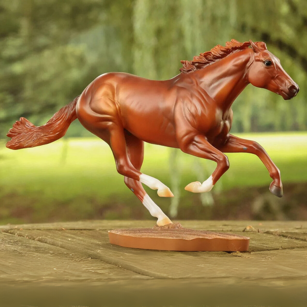 Este modelo Breyer Traditional (escala 1:9) captura la poderosa estampa de este alazán de gran conformación, que corrió bajo los colores azul y blanco de Meadow Stables y dejó una huella imborrable en la historia del turf.