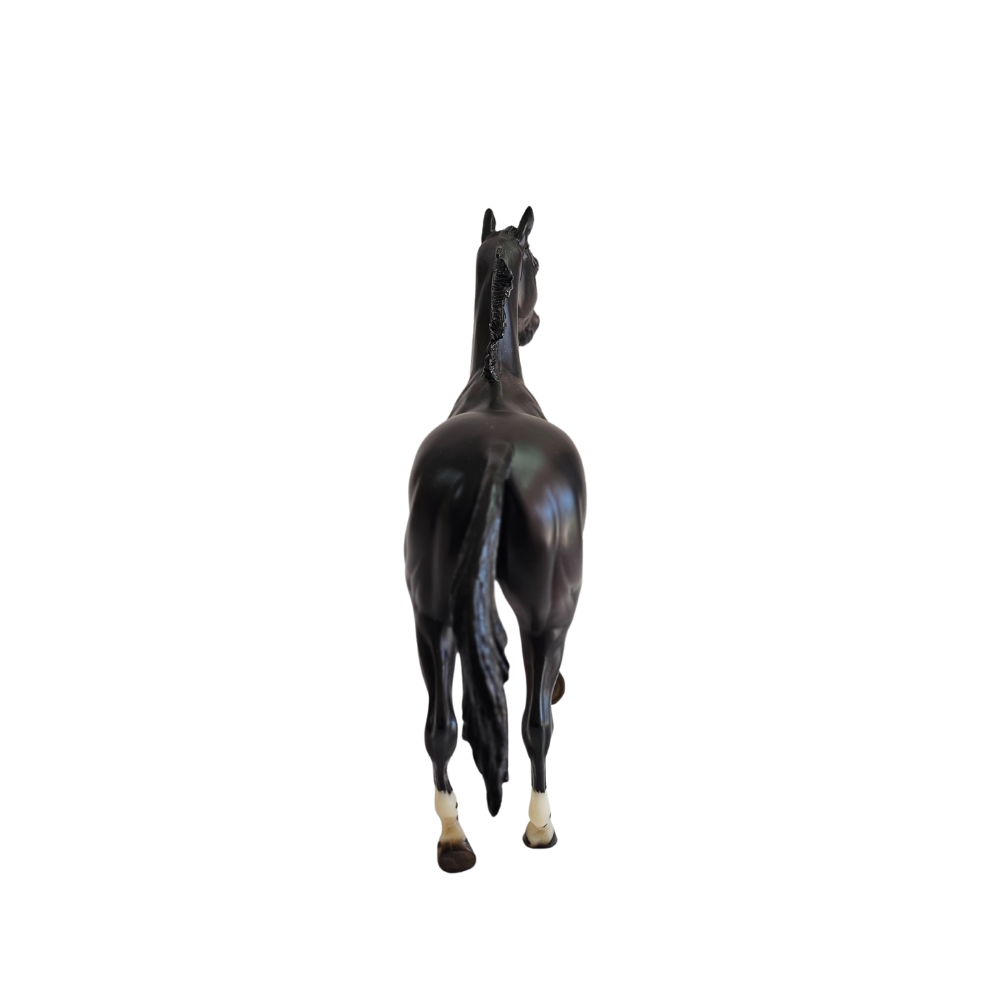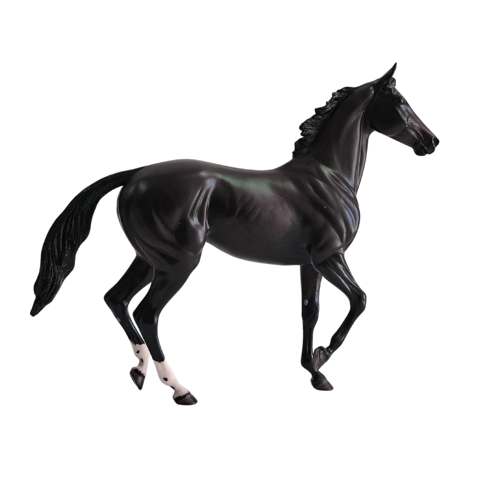 Esta figura realista de Breyer, parte de la serie "Breyer Traditional", rinde homenaje a su poderosa presencia en las pistas: una yegua de 17 manos, invencible y elegante, inmortalizada en una pose que transmite toda su fuerza y determinación.