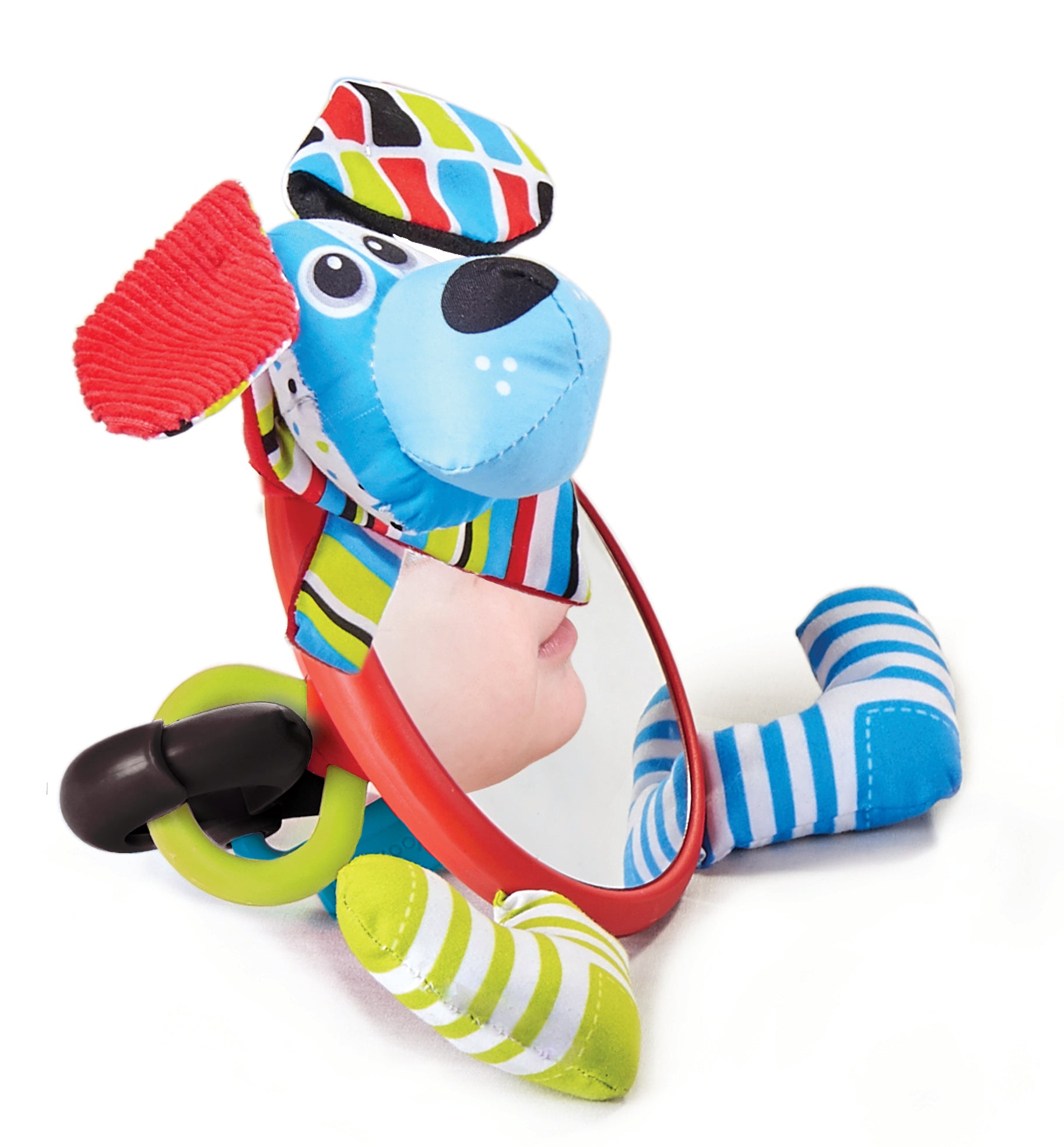 Mordedor accesible: colocado en la parte trasera del espejo, perfecto para que el bebé aprenda a alcanzarlo por sí mismo.