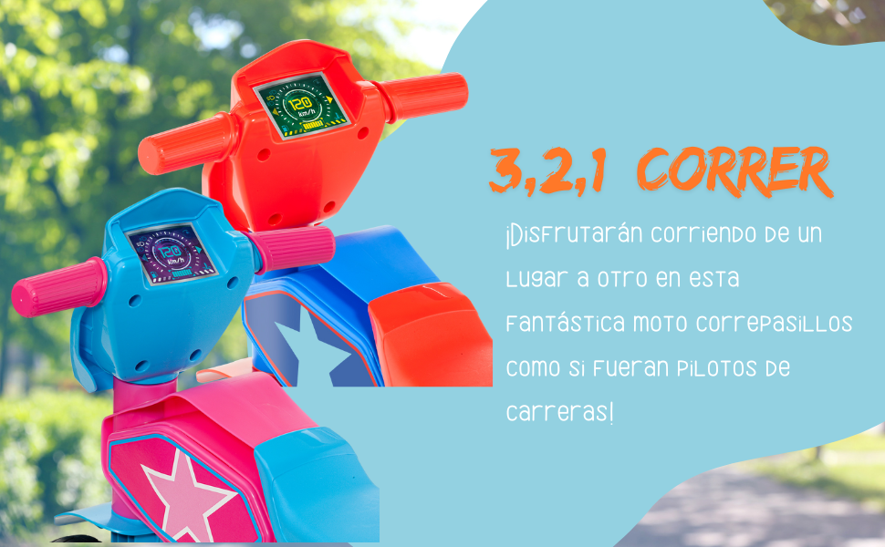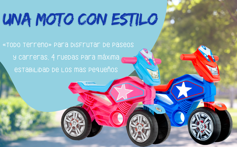 ¡Arranca la emoción con la Molto Cross Star! Diseñada especialmente para los más pequeños, esta moto correpasillos de cuatro ruedas ofrece máxima estabilidad y seguridad, perfecta para que tu peque empiece a moverse con confianza desde los 18 meses. Con su diseño deportivo y colorido, es la combinación ideal de diversión, desarrollo motor y juego activo.