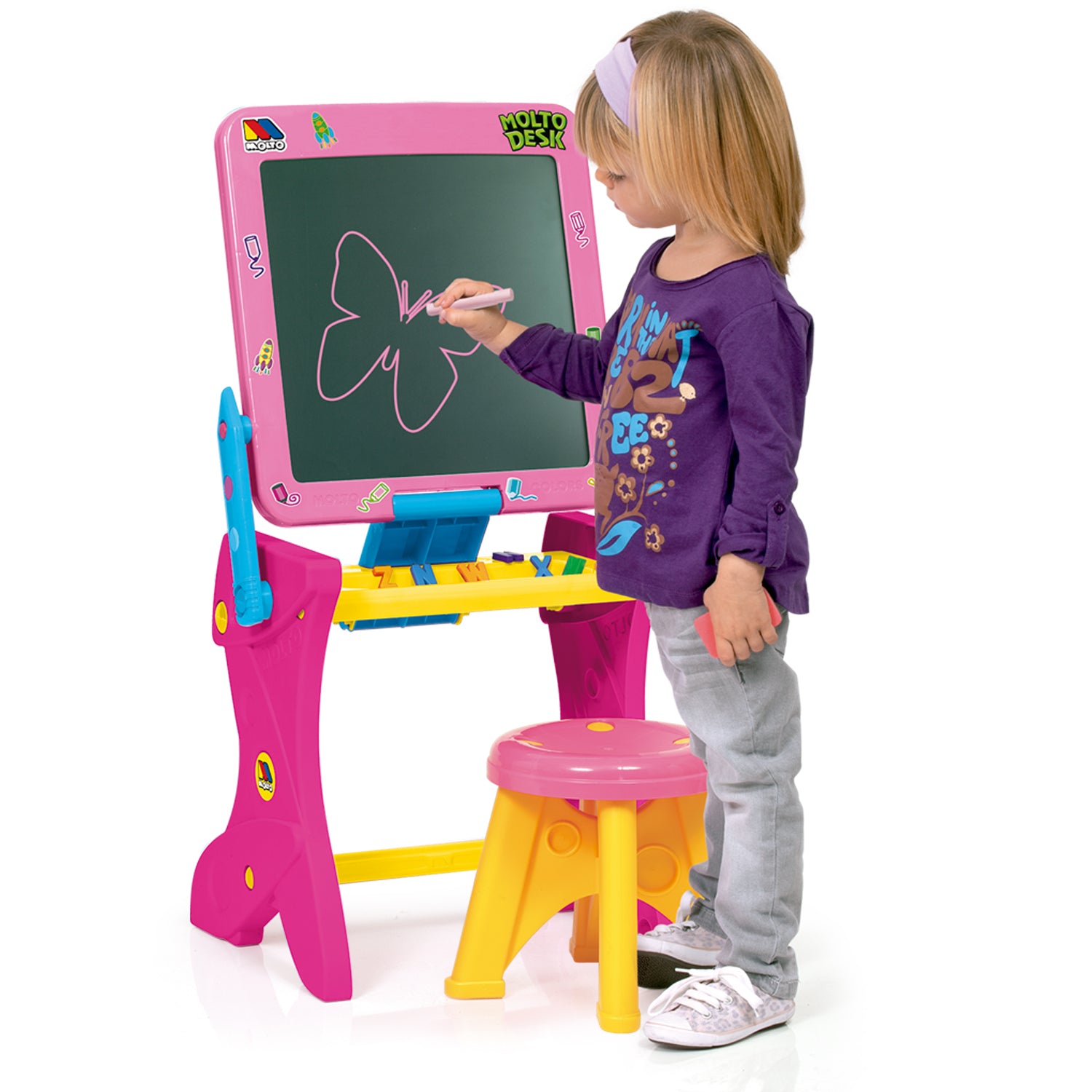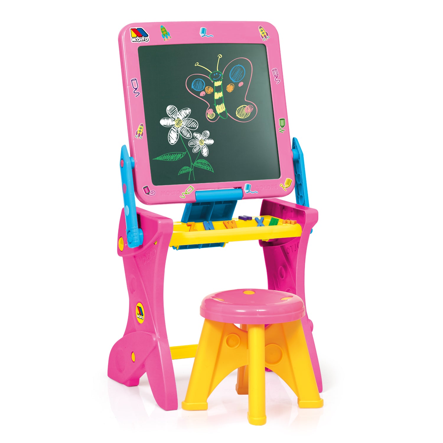Molto - Play Desk Blackboard Rosa– Pizarra 2 en 1 que se convierte en mesa + taburete + 30 accesorios 🎨