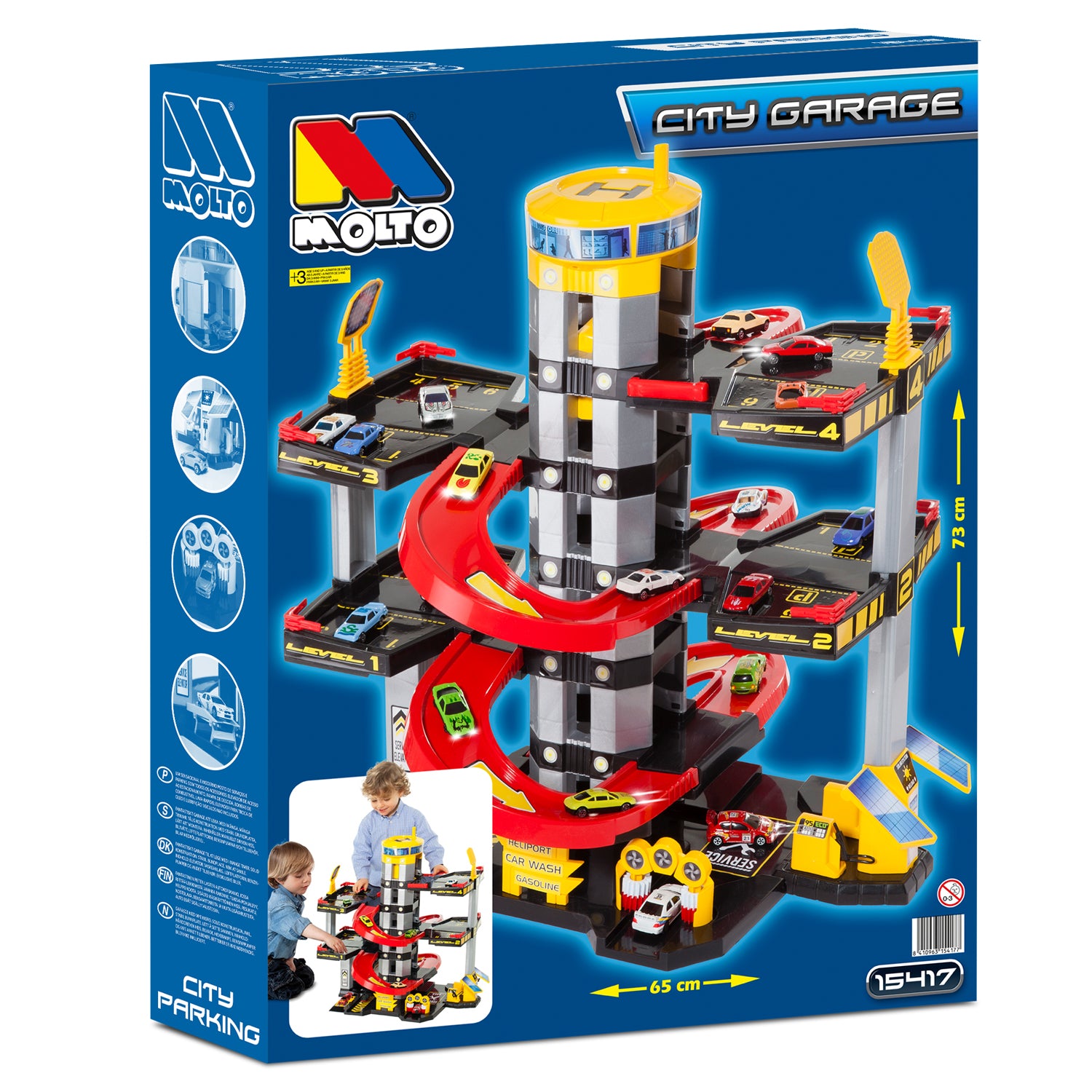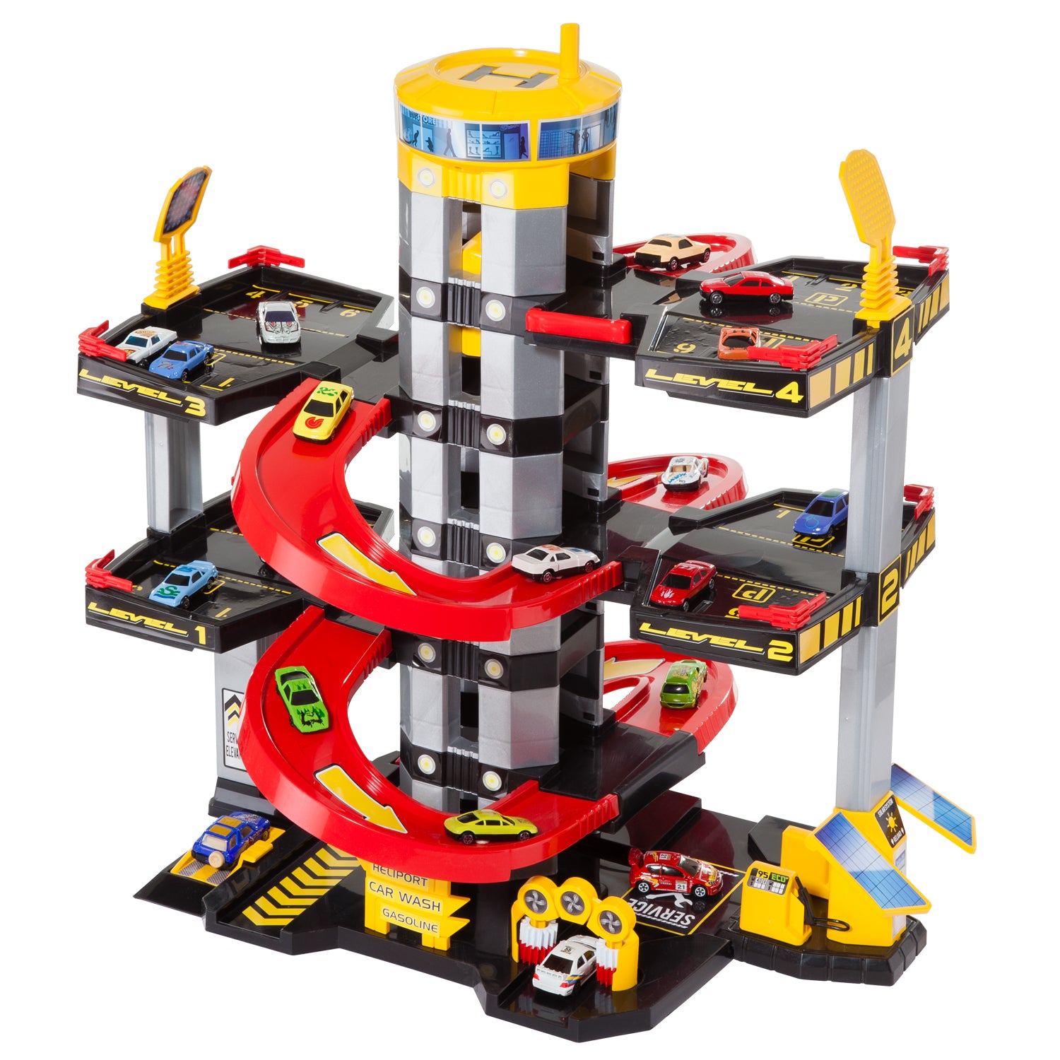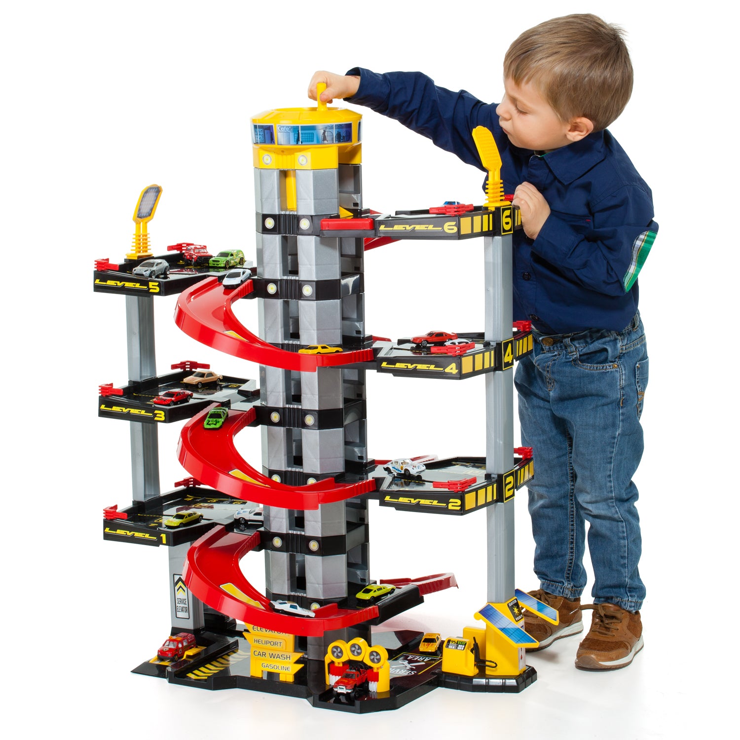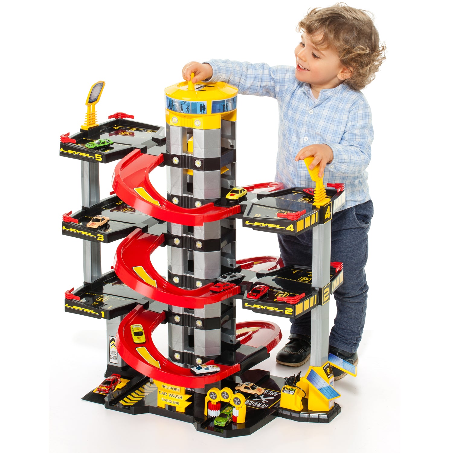 Imagina la cara de tu peque cuando vea frente a él un garaje gigante de hasta 7 plantas, con rampas para correr coches a toda velocidad, un ascensor para subir al último piso, una estación de servicio y hasta un lavadero. 🧼⛽